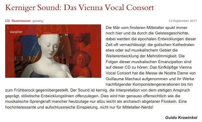 Was mag wohl in den Menschen vorgegangen sein, als sie um 1365 herum die mehrstimmigen Gesänge von Guillaume de Machauts Messe de Nostre Dame zum ersten Mal gehört haben? War Ihnen diese Art der Mehrstimmigkeit vertraut? Oder hat es die Leute vor den Kopf gestoßen, so wie viele Menschen heute immer noch bei zeitgenössischer Musik die Nase rümpfen? Das Werk begleitet das Vienna Vocal Consort seit vielen, vielen Jahren. Selbst in unserem Kontext als Alte-Musik-Ensemble fühlte sich die von der späteren Renaissance-Musik so abweichende Harmonik und Rhythmik lange Zeit wie ein Ausflug in ein völlig fremdes Paralleluniversum an.